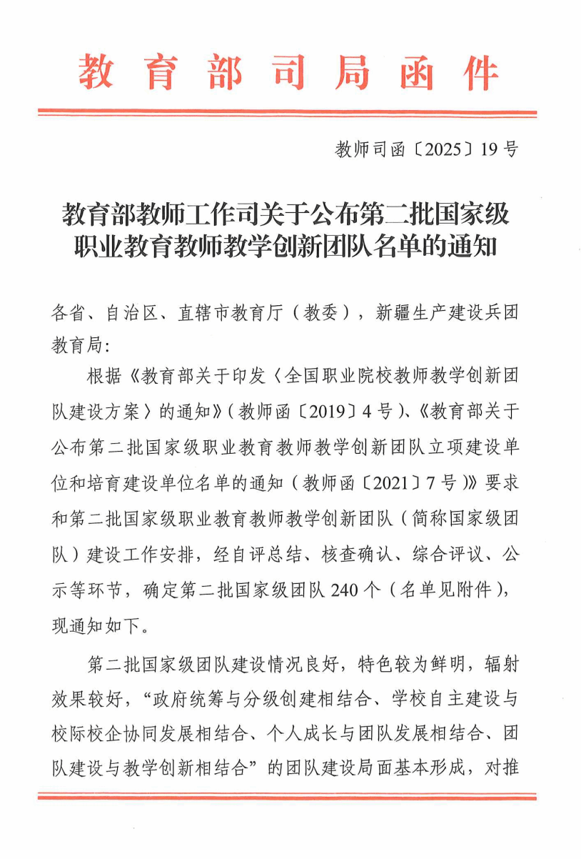 近日,教育部教师工作司公布了第二批国家级职业教育教师教学创新团队名单,我校无人机应用技术职业教育教师教学创新团队圆满完成各项建设任务,顺利通过验收。团队聚焦测绘地理信息行业无人机人才需求谋发展,扎根西部边疆做示范,打造了一支师德高尚、业务精湛、结构合理、充满活力的高素质专业化教师队伍。团队顺利验收标志着我校在深化教育教学改革、打造高水平“双师型”教师队伍方面取得了重要成就,为全国职业教育教师团队建设提供了可借鉴的样板。