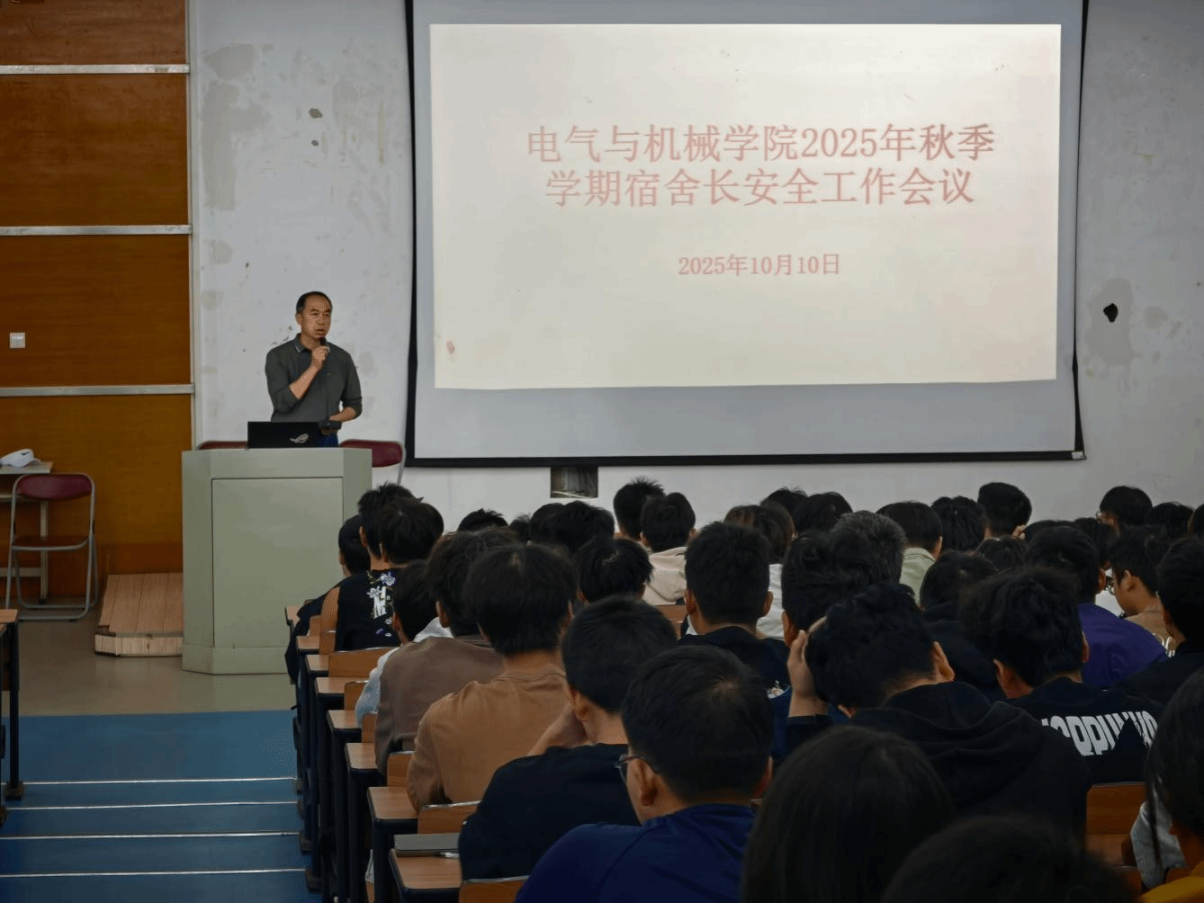 2025年10月10日,电气与机械学院在主教楼第2阶梯教室召开秋季学期宿舍长安全工作会议。学院王军老师参加会议并为全院400多名宿舍长做安全工作动员和专题培训。