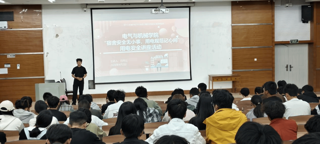 为进一步强化学生宿舍用电安全意识,防范和消除宿舍用电安全隐患,保障学生人身财产安全和校园稳定,2026年4月2日,电气与机械学院青协家电维修部在教学主楼四阶梯教室开展了“宿舍安全无小事,用电规范记心间”用电安全主题讲座。本次讲座由机电2473班石向云同学担任主讲人,共100名学生参加。
