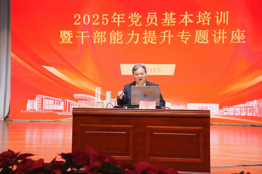 11月7日上午,学校举办2025年党员基本培训暨干部能力提升专题讲座,邀请中国高等教育学会职业教育分会理事长周建松教授作题为“认真学习贯彻党的二十届四中全会精神和《教育强国建设规划纲要(2024—2035年)》,精心谋划学校‘十五五’事业发展和专业建设规划”的专题辅导。本次讲座在大学生艺术中心设立主会场,同时以视频直播形式开设各二级党组织分会场。讲座由学校党委书记杨金华主持,学校党委委员、校领导,副科级以上干部,各二级党组织师生党员共900余人参加此次学习。