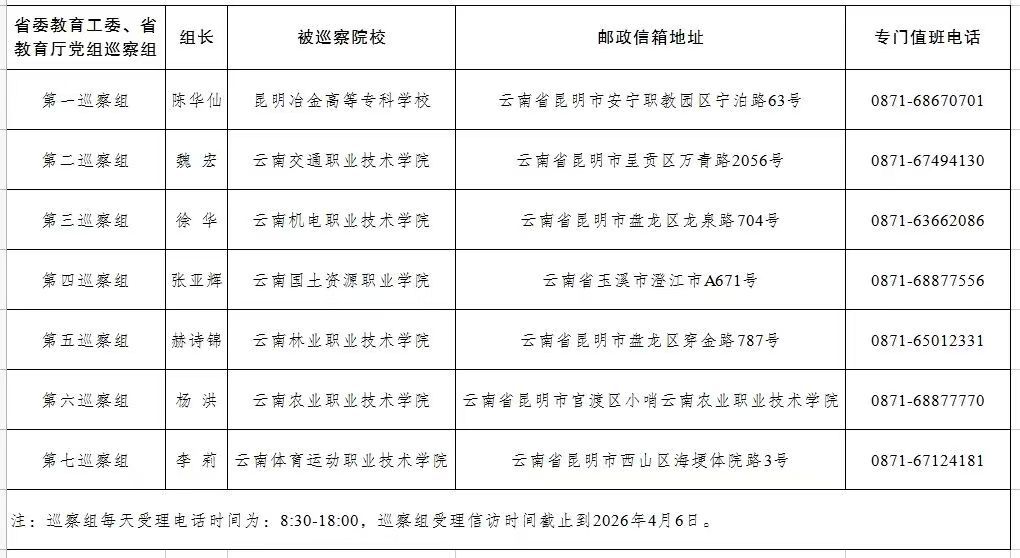 省委教育工委、省教育厅党组巡察组将在被巡察院校工作30天左右,在巡察期间设专门值班电话、邮政信箱,主要受理反映被巡察院校党委领导班子及其成员、下一级党组织主要负责人和重点岗位人员问题的来信来电来访,重点是关于违反政治纪律、组织纪律、廉洁纪律、群众纪律、工作纪律和生活纪律等方面的举报和反映。省委教育工委、省教育厅党组巡察组受理信访时间截止到2026年4月6日。