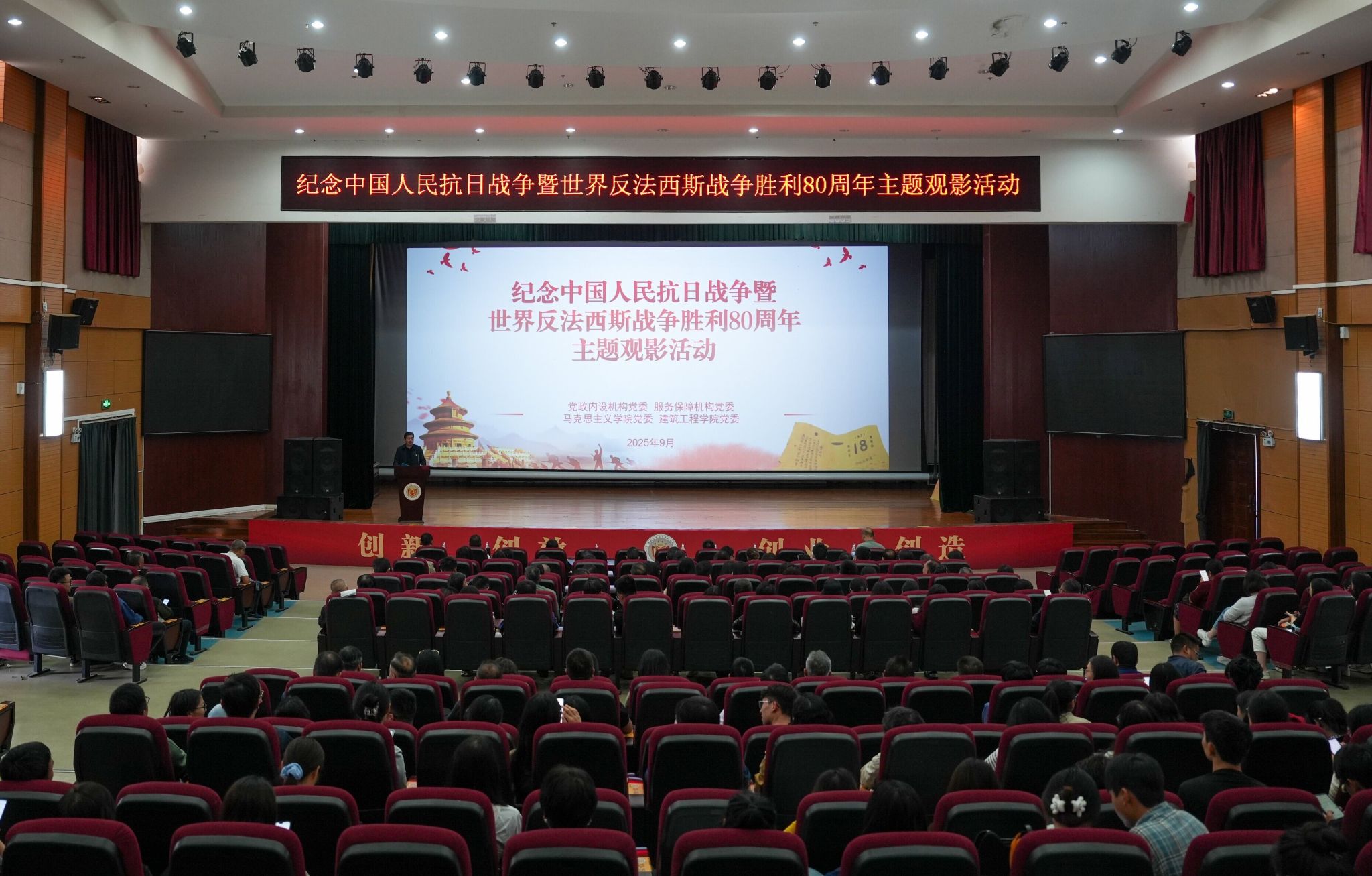 为纪念中国人民抗日战争暨世界反法西斯战争胜利80周年,引导广大党员干部和师生群众弘扬伟大抗战精神,铭记历史、缅怀先烈,团结一心、砥砺奋进,9月28日,党政内设机构党委联合服务保障机构党委、马克思主义学院党委、建筑工程学院党委开展“铭记历史,砥砺奋进——纪念中国人民抗日战争暨世界反法西斯战争胜利80周年主题观影活动”,在校领导、200余名师生集体观看了重大历史题材影片《731》。