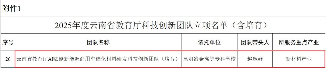 近日,云南省教育厅公布2025年度科技创新团队立项建设名单,我校申报的“AI赋能新能源商用车催化材料研发科技创新团队(培育)”成功获批立项。