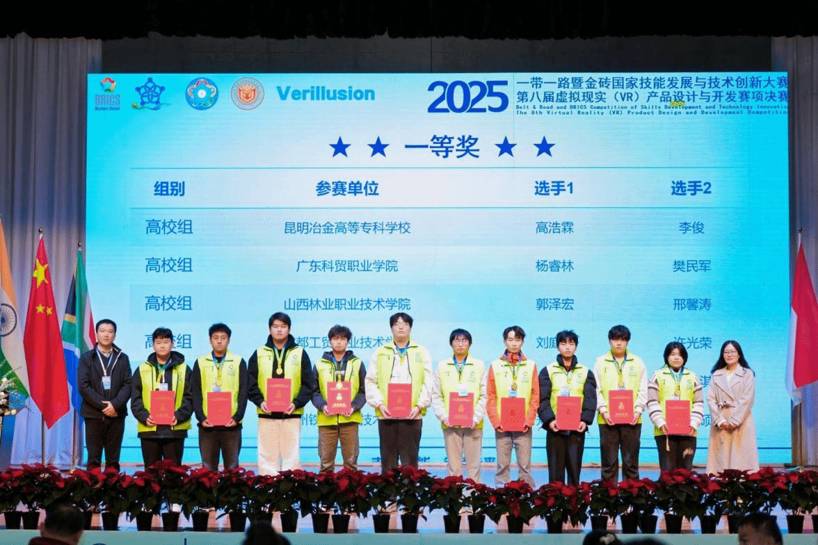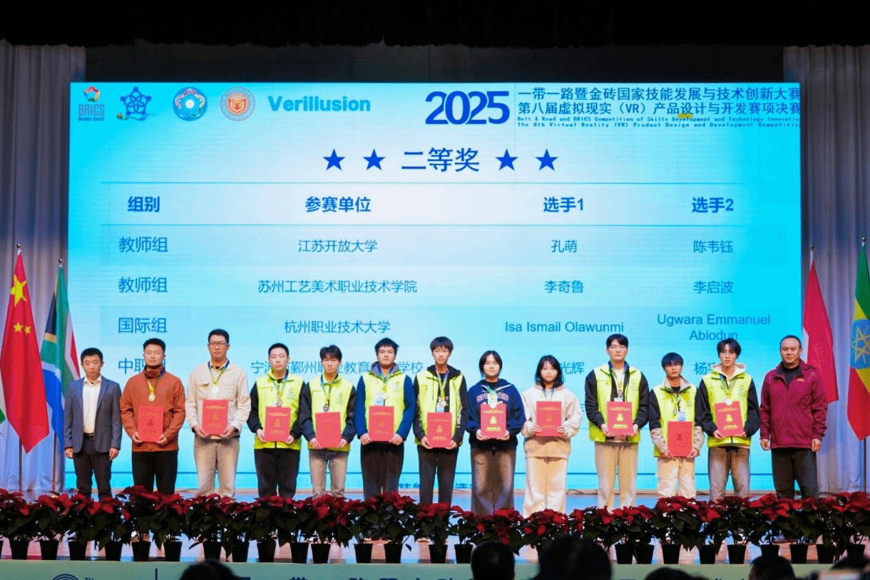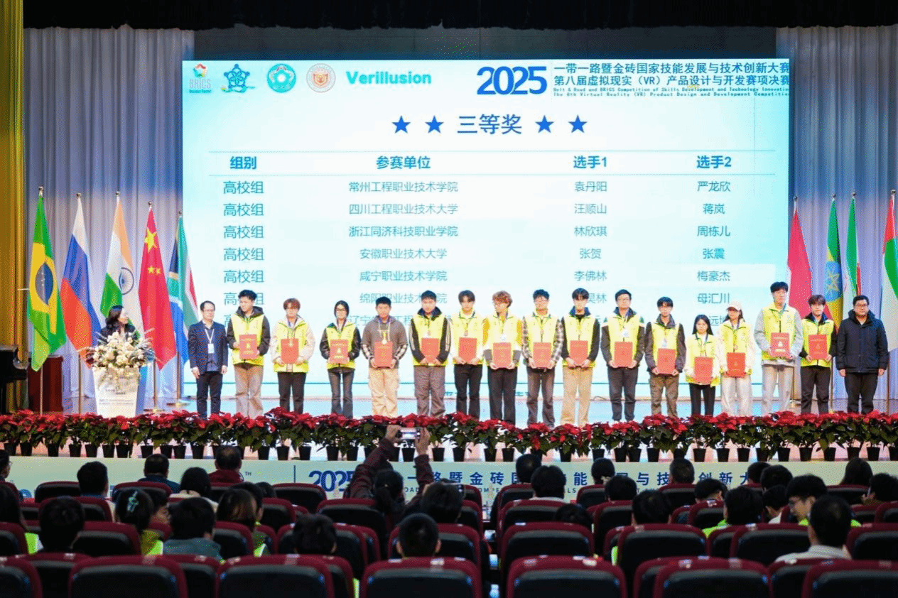 经过三天的激烈角逐,2025一带一路暨金砖国家技能发展与技术创新大赛第八届虚拟现实(VR)产品设计与开发决赛在我校落下帷幕。11月3日上午,大赛闭幕式暨颁奖仪式在学校大学生艺术中心举行。
