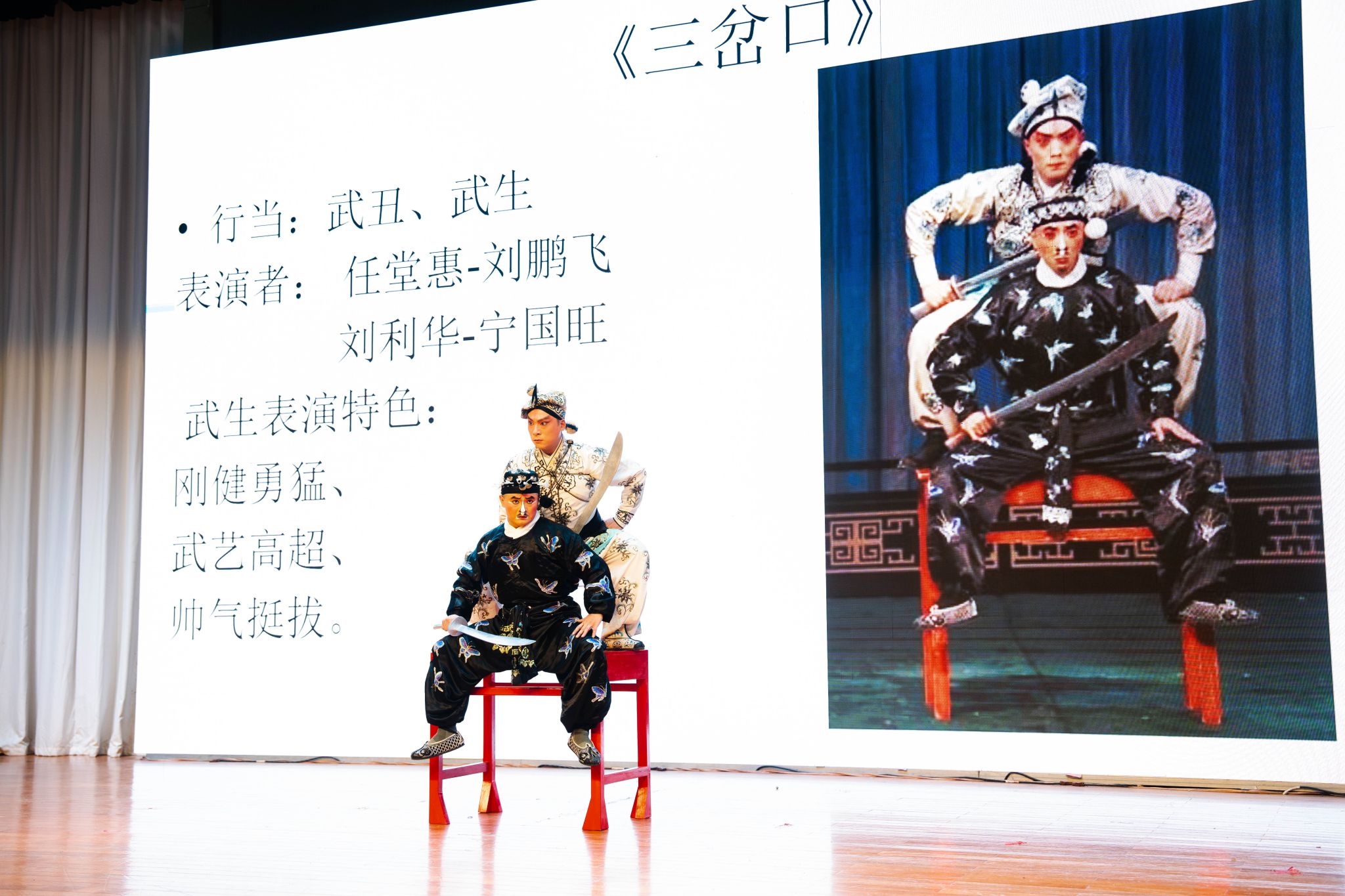 活动中,朱福老师以独特视角和生动语言,深入浅出地讲解了京剧艺术的形成发展、行当组成、四功五法及程式表演魅力。他不仅亲自示范经典动作,更携团队精彩演绎了《珠帘寨》《卖水》《霸王别姬》《三岔口》等名段,展现了京剧“程式美”与“意境美”,赢得现场师生阵阵掌声。