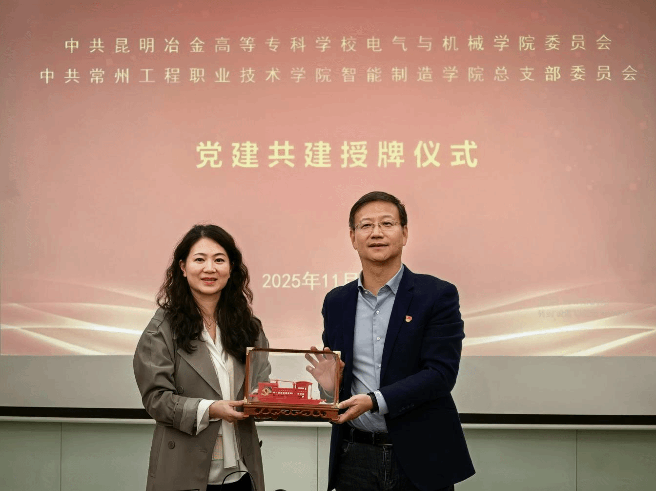 座谈会现场,为推动校际基层党组织深度交流,五所兄弟院校二级学院党组织代表共同签署《党建共建协议书》,搭建校际“联动网”,通过组织共建强根基、资源共享破壁垒、活动共办聚合力,构建起常态化、长效化的深度交流机制,激活校际协同发展新动能,全力打造一流基层党组织育人新模式。会上,五所兄弟院校共同为“党建共建基地”揭牌,田怡代表昆明冶金高等专科学校电气与机械学院党委向常州工程职业技术学院智能制造学院、轨道交通高端装备学院党总支赠送“红船”3D打印模型。