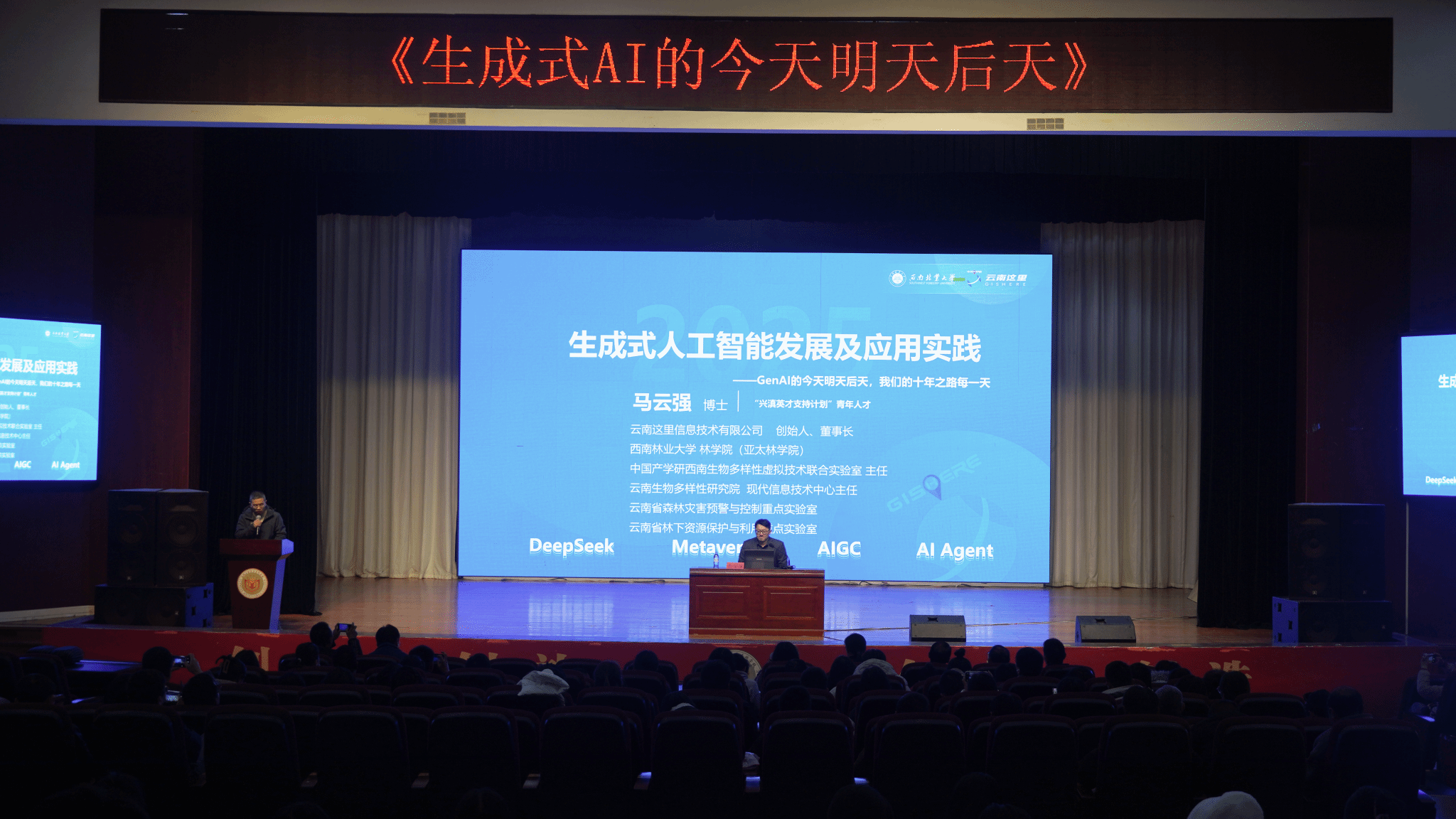 作为深耕AI、元宇宙、无人机等技术产业应用的先行者,马云强博士兼具深厚的技术积淀与丰富的实战经验,其团队打造的“生物多样性网上博物馆”更是全球首个生态科普VR平台,他个人也斩获梁希科技进步二等奖等省部级以上奖项10余项。讲座中,马云强博士以“行业入局者”的实战视角,从技术纵深、案例实践、产学研路径三大维度展开分享。在技术层面,他系统解析了生成式AI从实验室原型到产业落地的演进逻辑与关键节点;在实践案例部分,结合其团队在智慧森防、生物多样性信息化领域的成果,详细介绍了“林业有害生物智能监测平台”服务全国 110 +县区、“智慧林医”平台为4万余用户提供80万余次技术服务等实操经验,生动展示了生成式AI解决真实产业问题的能力;此外,他还分享了十年“AI+产学研”创新经验,拆解了技术、场景、资源协同的落地方法论。