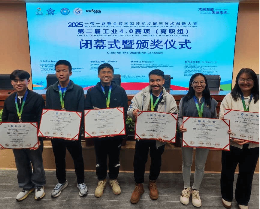 12月20日,2025一带一路暨金砖国家技能发展与技术创新大赛第二届工业4.0赛项(高职组)决赛在赣西科技职业学院落下帷幕,我校电气与机械学院代表队表现优异,喜获佳绩。本次赛事共吸引了全国18个省市近200名选手参与智能制造领域的技能比拼,经过激烈的角逐,我校电气与机械学院朱洪志、梅祖强两位同学荣获学生组全国二等奖,郭宵宇、尹安藤、李晶、孔艳四位教师荣获教师组全国三等奖。同时,学院两位老师获评“优秀指导教师”,学校荣获“最佳组织奖”,实现师生同台竞技、双线突破的优异成绩。