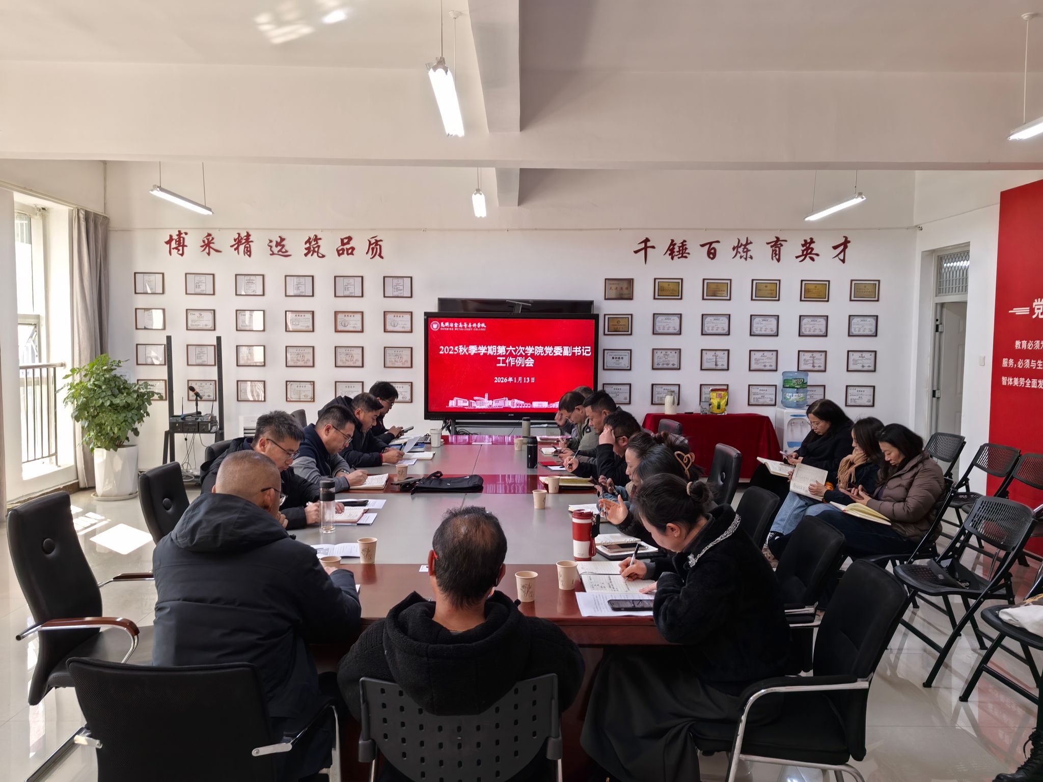 1月13日,学校在冶金与矿业学院508会议室召开2025年秋季学期第六次学院党委副书记工作例会。党委副书记杨永锋,学生处(学生工作部、武装部)、教务处、保卫处、招生就业中心、后勤与基建管理中心负责人及各有学生学院的党委副书记参加会议。