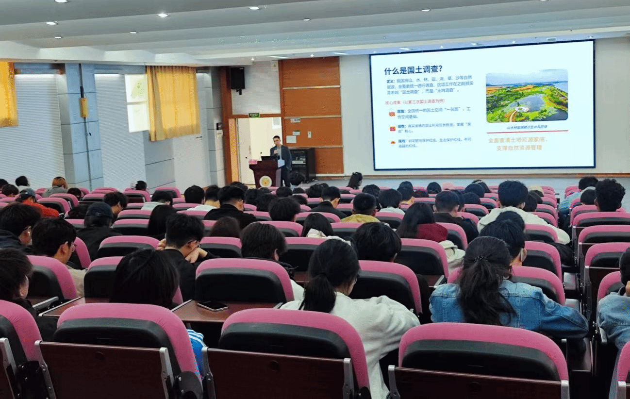 李锐深耕测绘地理信息领域多年,主持国土变更调查、地理国情普查等多项重大项目,兼具扎实理论功底与丰富一线实战经验。讲座中,他以国土调查为核心切入点,从其定义、核心任务与行业意义展开,梳理一调、二调、三调发展历程,清晰展现测绘行业从人工手绘、纸质作业到数字化操作,再到互联网 + 云端协同、天空地一体化作业的技术迭代,深入解读行业向互联网 + 时空体系的技术变革,以及产业升级趋势,让同学们系统认知行业发展逻辑。他结合第三次全国土壤普查、高标准农田建设等典型案例,剖析测绘地理信息技术在自然资源管理、农业发展、生态保护等领域的落地应用与实践成效,直观展现技术赋能价值。讲座最后,他结合行业新趋势为新时代测绘人指明能力提升与职业发展方向,强调行业亟需兼具3S核心技术、智能设备操作、数据挖掘能力,且能跨领域融合、懂管理的复合型创新人才。