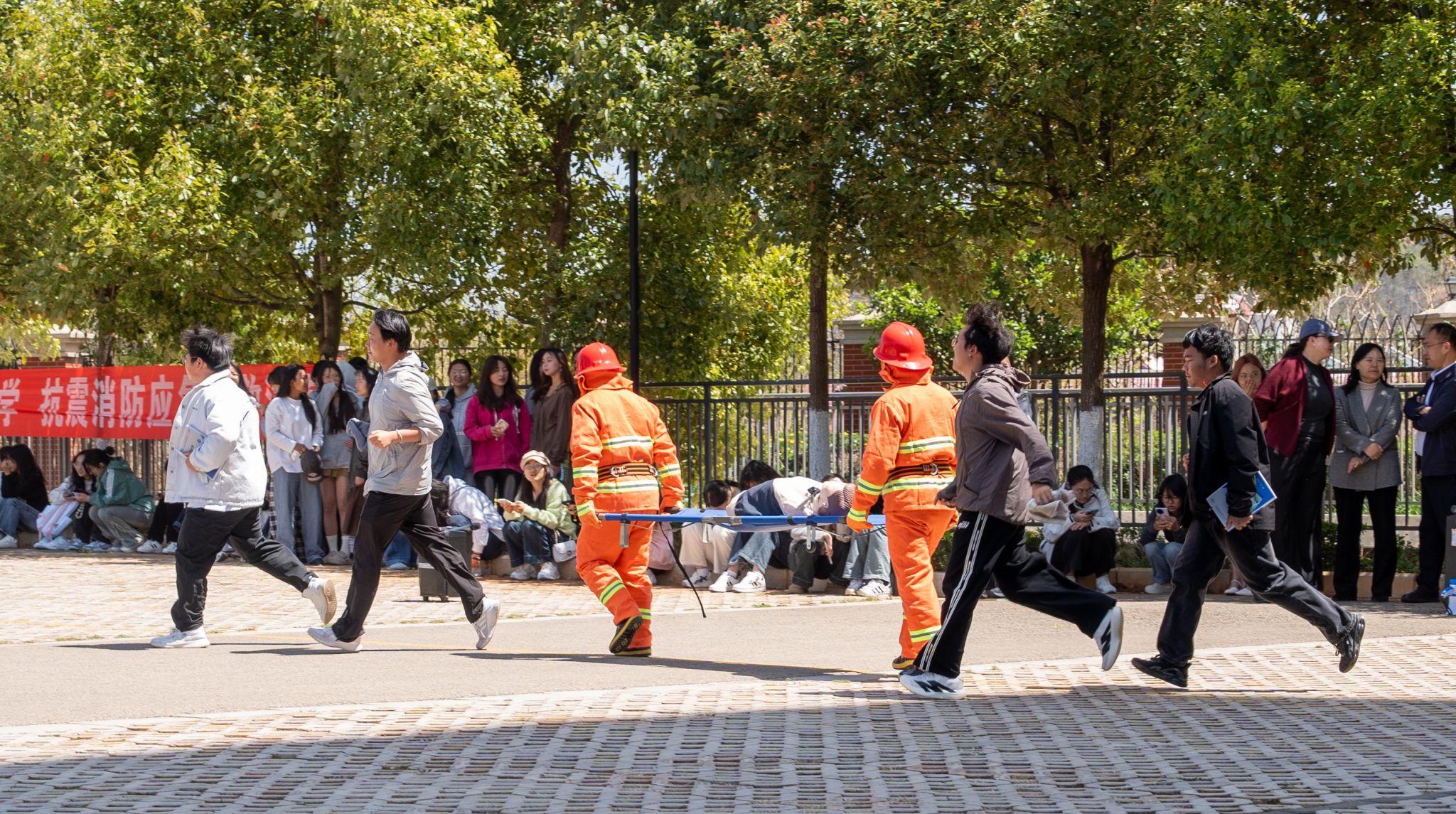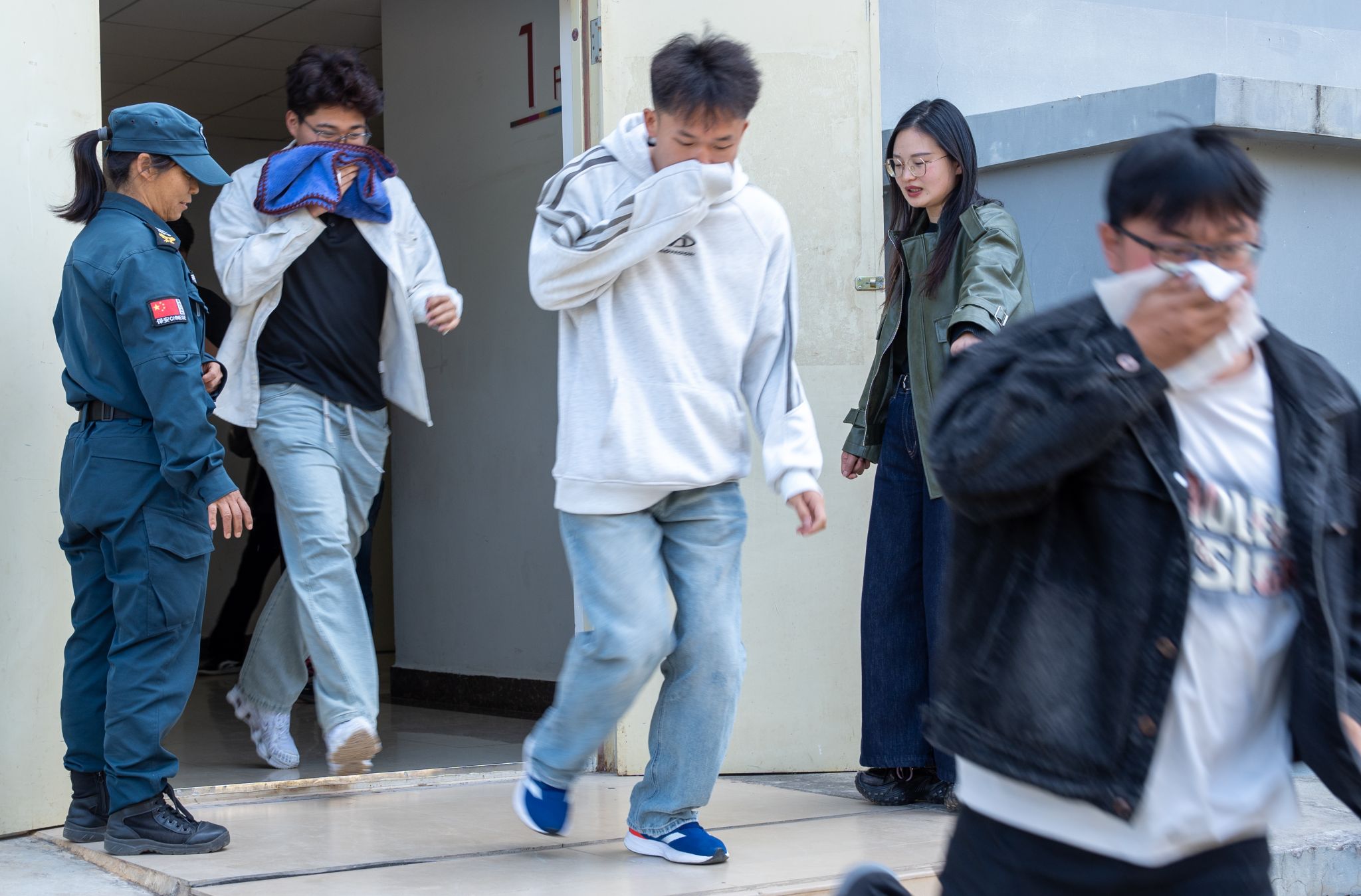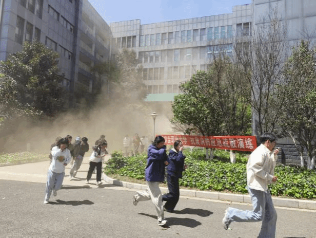 疏散演练中,师生严格遵循“低姿、捂鼻、快速、有序”原则,沿预定疏散路线快速撤离。在工作人员的引导下,保持安全间距,高效完成宿舍楼、教学楼等重点区域的疏散撤离,全程紧张有序、无拥挤踩踏风险。