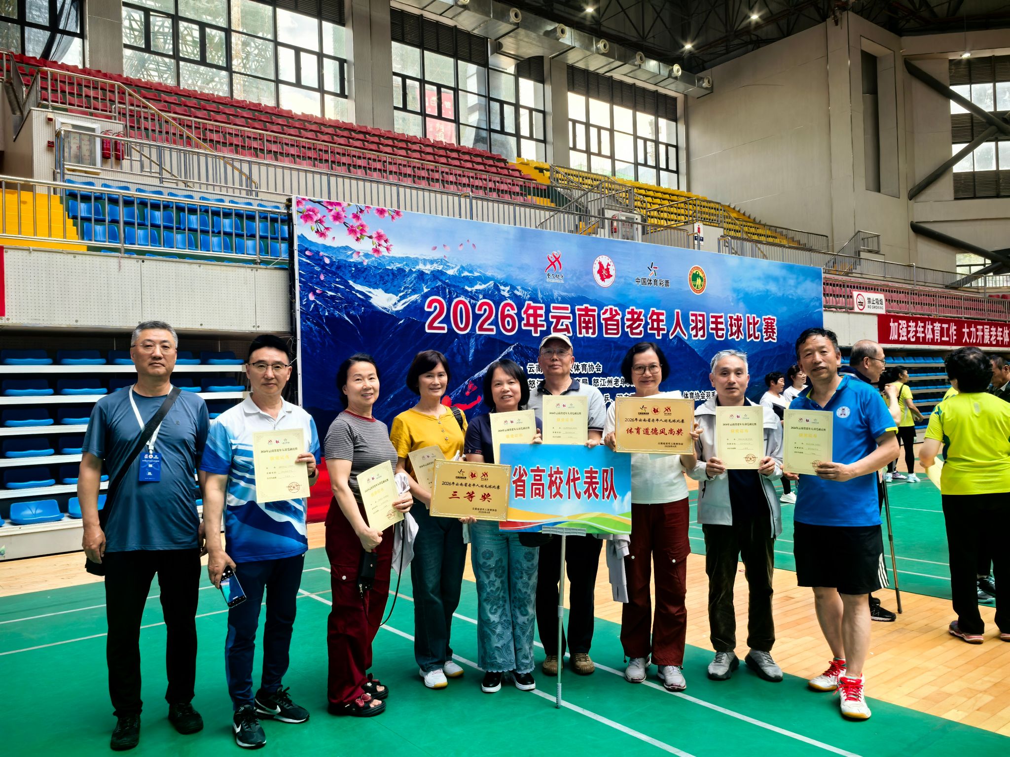 近日,由云南省老年人体育协会主办的“2026年云南省老年人羽毛球赛”在怒江傈僳族自治州泸水市怒江州民族体育馆圆满落幕。受云南省高校老体协委托,以我校老年羽毛球队为班底组建的代表队,凭借精湛的球技与良好的赛风,在本次大赛中荣获团体三等奖及“体育道德风尚奖”。