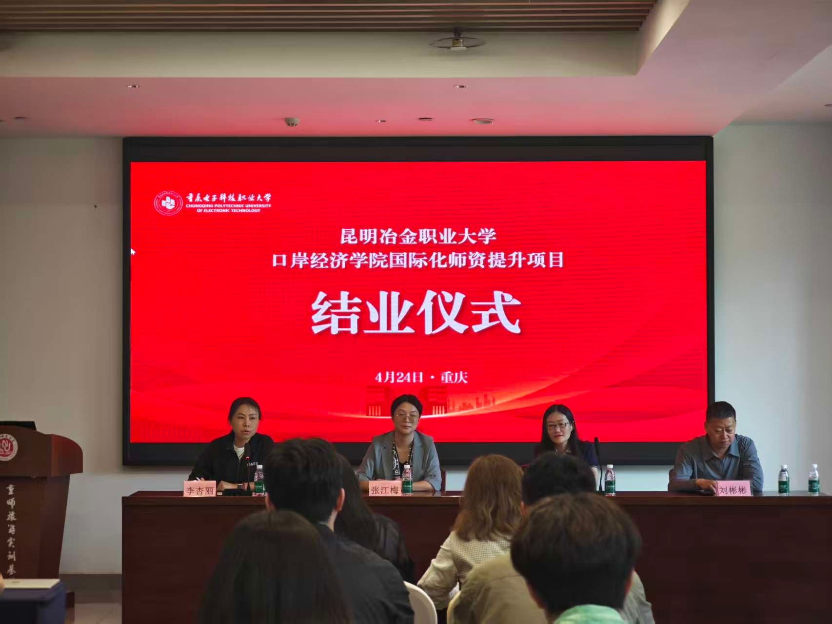 4月24日上午,昆明冶金职业大学“口岸经济学院国际化师资提升培训项目”结业仪式在重庆师范大学举行,此次项目由中德职业教育产教融合联盟、德国法兰克福科技创新学院主办,我校对外合作交流处副处长程文玲率队,来自有色金属智能冶金技术专业群5个专业的骨干教师及涉外合作办学项目人员共20人完成为期6天的研修并顺利结业。