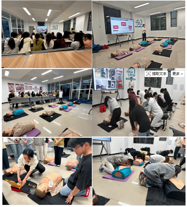 培训采用 “理论精讲 + 实操实训”相结合的模式,分批次在学校“一站式”学生社区开展。理论环节授课专家深入浅出解析急救原理与注意事项,实操环节借助专业模拟教具,手把手指导参训学员规范操作,逐一纠正动作细节,确保每位学员吃透要点、熟练掌握。参训学生骨干态度端正、认真投入,积极参与实操练习,现场学习氛围浓厚,培训取得良好成效。