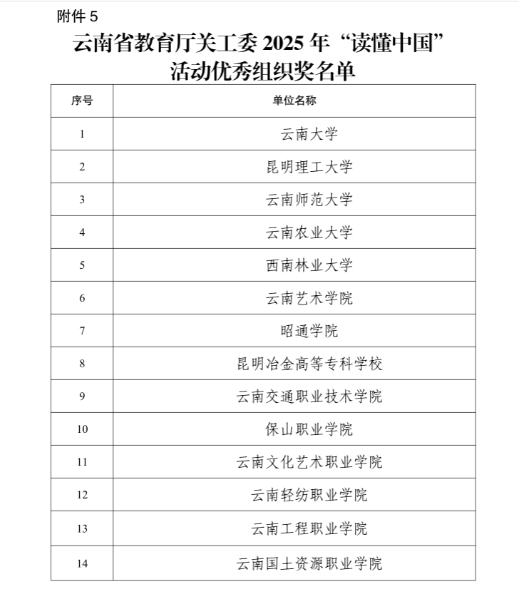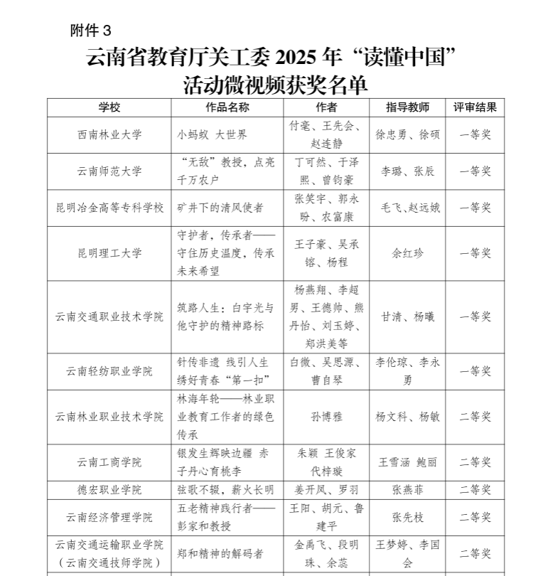 本次活动由我校关心下一代工作委员会根据《云南省教育厅关心下一代工作委员会转发教育部关工委关于开展2025年“读懂中国”活动的通知》组织参与。活动共征集到征文21篇,其中符合要求的17篇;征集到微视频作品1件。经专家评审,共评选出优秀作品6件(征文5篇、微视频1件)报送至云南省教育厅关心下一代工作委员会参评。