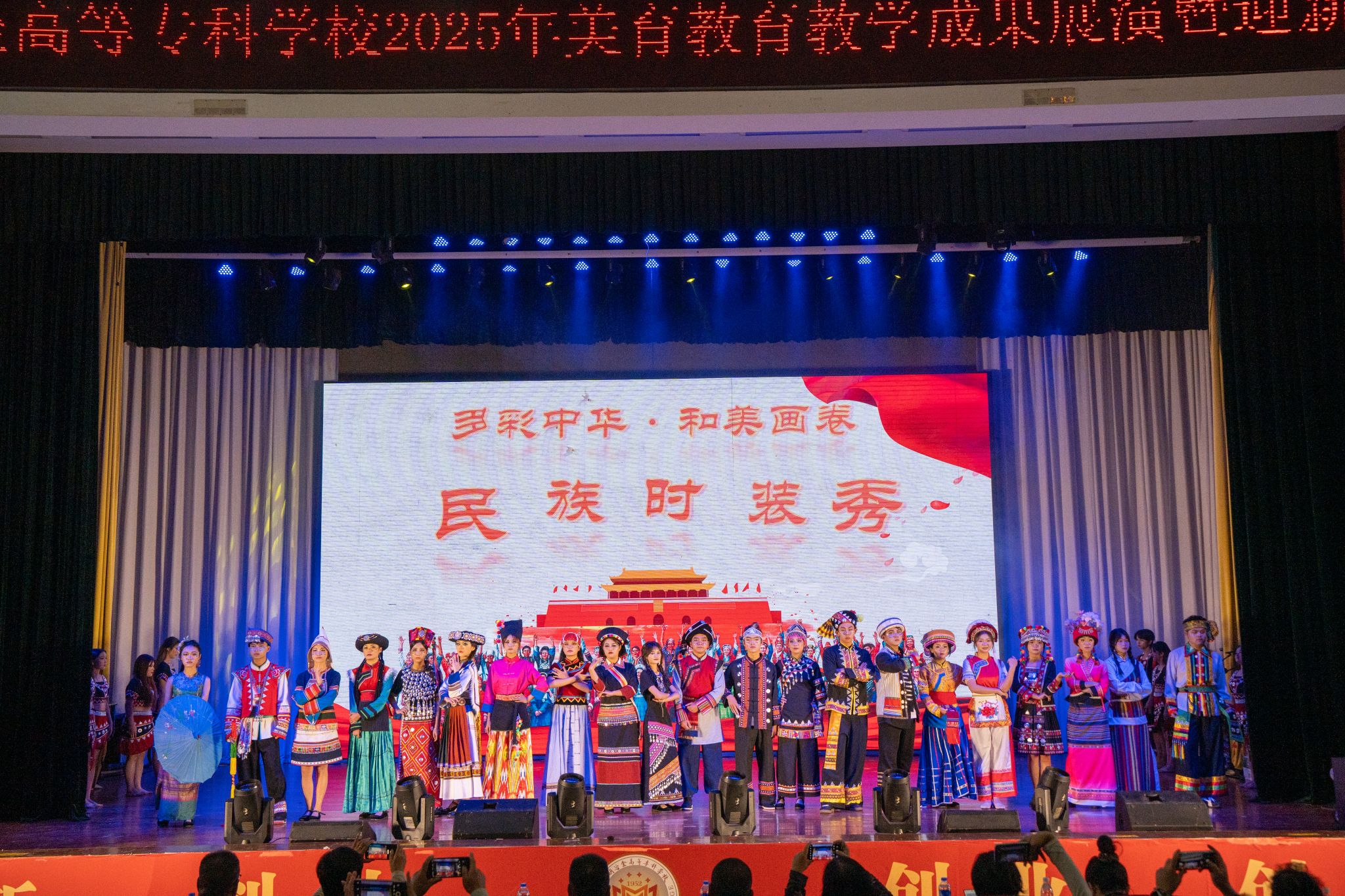 民族时装秀《多彩中华・和美画卷》展示 15 个云南独有民族的服饰文化,白族扎染、傣族银饰、哈尼刺绣等非遗技艺与《民族民间音乐鉴赏》《舞蹈实践训练》课程相融,生动诠释了文化传承的基因密码。