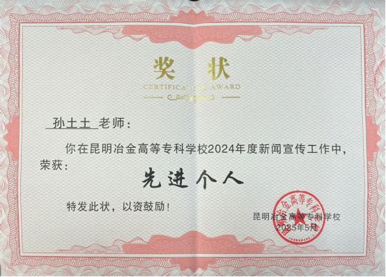近日,昆明冶金高等专科学校2024年度新闻宣传表彰榜单正式揭晓:计算机信息学院官方微信公众号荣获“十佳新媒体”殊荣;孙土土老师荣获“先进个人”称号。