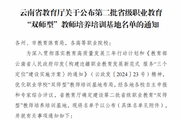 近日,云南省教育厅公布《第二批省级职业教育“双师型”教师培养培训基地名单》,经学校自主申报、专家综合评议、省厅审定等程序,学院电子与信息大类成功入选云南省第二批省级职业教育“双师型”教师培养培训基地。