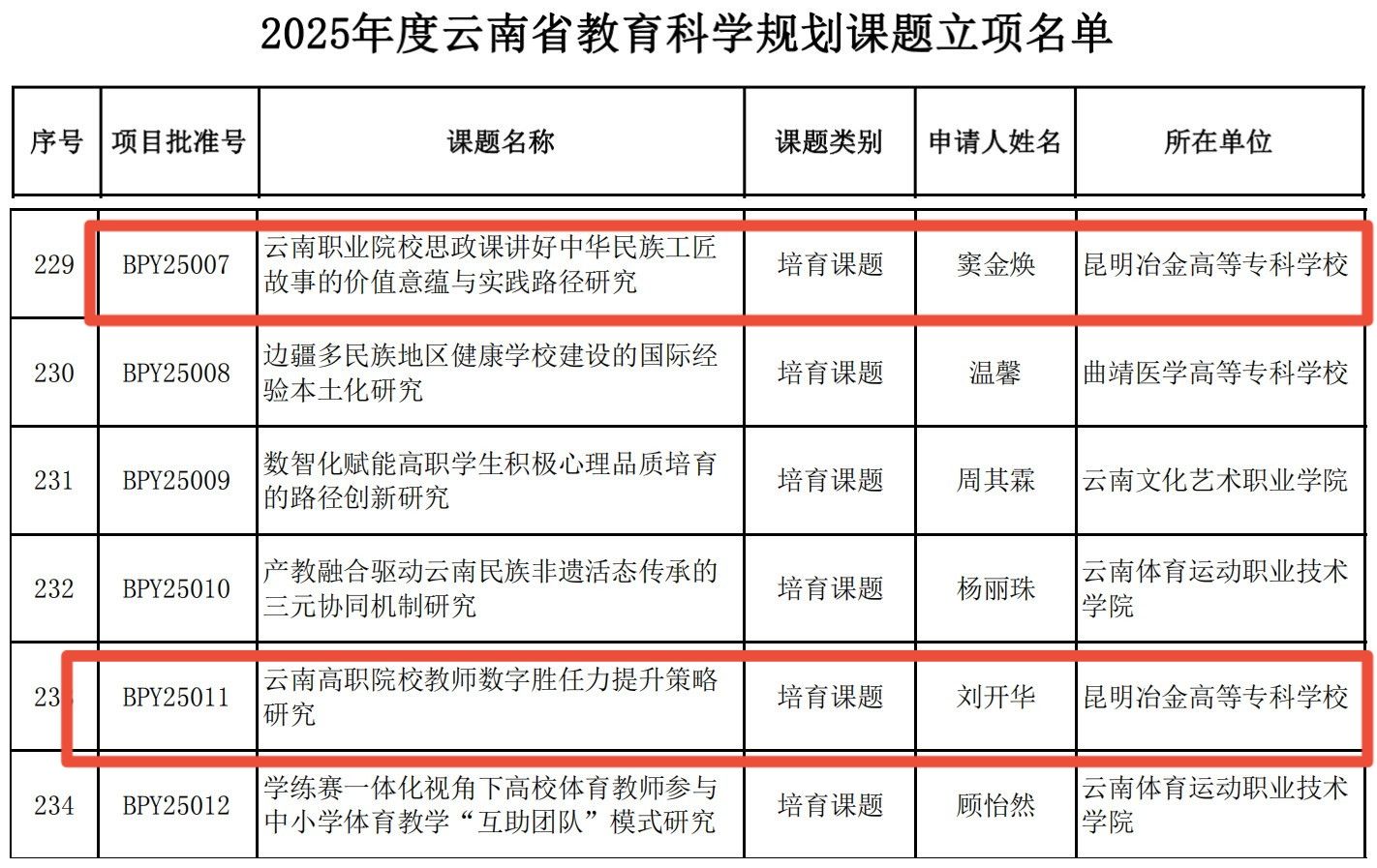 近日,2025年度云南省教育科学规划课题立项名单公布,我校马克思主义学院刘开华、窦金焕两位老师申报的课题获准立项。其中,刘开华老师的“云南高职院校教师数字胜任力提升策略研究”、窦金焕老师的“云南职业院校思政课讲好中华民族工匠故事的价值意蕴与实践路径研究”,彰显了我院教师科研实力。一直以来,学校高度重视教育科研,以推动学校内涵发展、提升人才培养质量为目标,通过完善制度、搭建平台、提供经费支持,全力支持教师科研。马克思主义学院积极落实学校部署,将科研能力建设作为教师队伍发展重点,鼓励教师围绕职教痛点、思政难点研究,形成“以研促教、以教带研”氛围。此次立项是对教师能力的肯定,更是校院支持科研的成果。未来,学校与学院将继续加大科研支持,助力课题推进,鼓励更多教师投身科研,以科研创新赋能职教高质量发展,为《云南省教育高质量发展三年行动计划(2023-2025)》落地贡献力量。