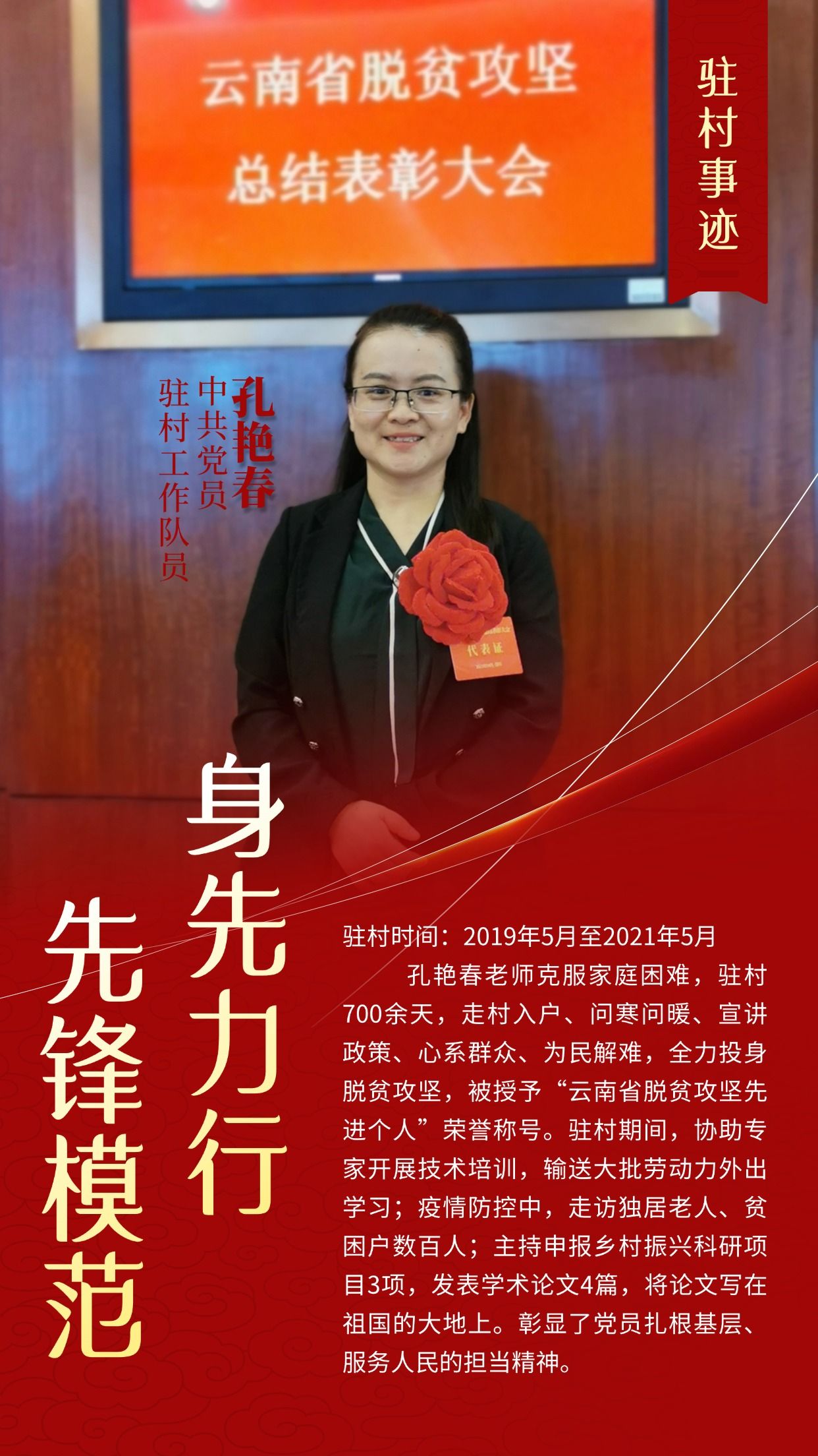 孔艳春,女,中共党员,驻村时间:2019年5月至2021年5月。孔艳春同志扎根国家级深度贫困村澜沧县富东乡小坝村,克服家庭困难,驻村700余天,走村入户、问寒问暖、宣讲政策、心系群众、为民解难,全力投身脱贫攻坚,被授予“云南省脱贫攻坚先进个人”荣誉称号。驻村期间,协助专家开展技术培训,输送大批劳动力外出学习;疫情防控中,走访独居老人、贫困户数百人;主持申报乡村振兴科研项目3项,发表学术论文4篇,将论文写在祖国的大地上。彰显了党员扎根基层、服务人民的担当精神。