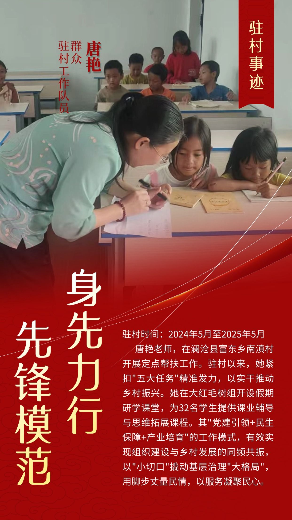 按照上级安排,在普洱市澜沧拉祜族自治县富东乡南滇村开展定点帮扶工作。驻村以来,唐艳同志紧扣"五大任务"精准发力,以实干推动乡村振兴。一是夯实党建根基,协助村支部规范"三会一课"制度,完善党员档案管理;二是筑牢防返贫防线,组织村民缴纳"两险",动态监测风险户;三是激活发展动能,推动特色产业调研,建立防返贫预警机制;四是创新基层治理,优化村规民约,推行"四议两公开"民主议事;五是践行民生服务,在大红毛树组开设假期研学课堂,为32名学生提供课业辅导与思维拓展课程。其"党建引领+民生保障+产业培育"的工作模式,有效实现组织建设与乡村发展的同频共振,以"小切口"撬动基层治理"大格局",用脚步丈量民情,以服务凝聚民心。